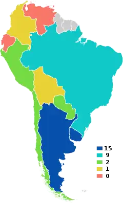 With 15 titles, Argentina and Uruguay are the most successful Copa América teams.[6] Brazil has nine. The other former champions are Paraguay, Peru and Chile, with two titles each, and Bolivia, and Colombia, who have each won one.[7]