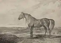 Copenhagen was bred by General Grosvenor,[1] a nephew of the Earl of Grosvenor.[2] Copenhagen's sire, Meteor, was second in the 1786 Derby and won several stakes races before he was retired in 1791 to the Earl of Grosvenor's stud. Copenhagen was foaled when Meteor was 25 years old, and the stallion died in 1811 when Copenhagen was three years old.[3] Copenhagen's dam, Lady Catherine, was a daughter of the 1792 Epsom Derby winner John Bull and an unnamed mare sired by the Rutland Arabian out of "a hunting mare"[1] that was either "three parts Thoroughbred"[4] or had no Thoroughbred parentage at all.[1] The Rutland Arabian was owned by the Duke of Rutland and had limited success at stud.[5] Lady Catherine ("Lady Katherine" in the Racing Calendar) raced under General (then Colonel) Grosvenor's name as a five-year-old in 1801, and her dam was identified as "Morning Star's dam."[6] In 1810 Lady Catherine foaled a half-sister to Copenhagen, Chantress by Popinjay, and is noted in the stud-book to have been "sent to Ireland."[1] In honour of Copenhagen's notable military service, Lady Catherine is the only "half-bred" mare listed in the General Stud Book.[7]
