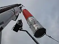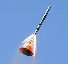 The SMARAGD rocket (emerald in Danish) is a 5.7 meter[30] two-stage rocket weighing 160 kg, intended to reach an altitude of 8 km,[31] that was used for testing various technological aspects of the operation. On July 27, 2012, the team set out from Nexø towards the launch site, intending to launch the SMARAGD rocket.[32][33] After some initial problems with the remote launch control,[34] the rocket launched successfully just after 1 pm[35][36] and reached the maximum altitude of 8.2 km.[37] It was evident shortly after takeoff that the nosecone containing electronics broke off during launch, possibly due to the large acceleration of estimated 20 g.[38]