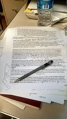 Copy editing (also known as copyediting and manuscript editing) is the process of revising written material (copy) to improve readability and fitness, as well as ensuring that a text is free of grammatical and factual errors.[2][3] The Chicago Manual of Style states that manuscript editing encompasses "simple mechanical corrections (mechanical editing) through sentence-level interventions (line, or stylistic, editing) to substantial remedial work on literary style and clarity, disorganized passages, baggy prose, muddled tables and figures, and the like (substantive editing)". In the context of print publication, copy editing is done before typesetting and again before proofreading.[4]:1–5[2] Outside traditional book and journal publishing, the term "copy editing" is used more broadly, and is sometimes referred to as proofreading; the term sometimes encompasses additional tasks.