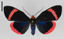 The forewings are brownish black, glossed with dark blue near the base, and crossed from about the middle of the costal margin to the anal angle by a bright carmine band edged on either side with a narrow row of pinkish-white scales. The band is widest on the costal margin. The hindwings are brown, glossed with very dark blue. The outer margins are broadly bordered with carmine.[2]