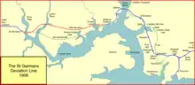 The Saltash to St Germans section was by-passed by an inland deviation which was opened for goods trains on 23 March 1908 and for passenger trains on 19 May; the former route section was then closed and abandoned. This left only the Royal Albert Bridge as the only single line section on the main line to Truro (Penwithers Junction). The Falmouth branch was never doubled.
