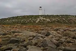 Corny Point is a headland located on the west coast of the Yorke Peninsula in South Australia about 37 kilometres (23 miles) north west of the town of Warooka. The point is described as being "a sloping rocky double projection..." where the "coast on the N[orth] side is low and sandy whereas the coast on the S[outh] side is higher than the point itself."[2] It is the south headland of Hardwicke Bay. It was named by Matthew Flinders on 18 March 1802. The waters adjoining its shoreline are within the Southern Spencer Gulf Marine Park. Since 1882, it has been the site of a navigation aid in the form of a lighthouse.[1][3][4][5][6][7]