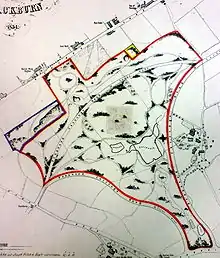 The first steps toward the establishment of the park were taken in 1845 when a sum of £4701 19s 7d was raised towards the purchase and implementation of the park by the sale of land on the town's moor.[9] The 50 acres (200,000 m2) for the park were secured in January 1855 with the purchase by the then Mayor, Thomas Dugdale, for the Corporation, from Joseph Feilden for £3,237 6s 3d. at £65 per acre.[10] Blackburn Corporation was also required to build public roads on the east and west sides of the estate (now East and West Park Roads) at an eventual cost of £4,480 17s 1d.[10] In 1855 work commenced on the Preston New Road entrance by Roberts and Walmsley, awarded the contract to build the arch and lodge at a cost of £789.[9] The East and West lodges were constructed at this time. In 1857 Three of the four fountains in the park built and paid for by Mayor William Pilkington, including the largest at the main entrance built by Varley's of Blackburn. The fourth fountain, which stands in the stream running down from the main lake, was built later than the others and was paid for by John Dean. It is made of slate and is of a simpler design than the others.[7] In 1857 two Russian cannons captured from Sevastopol during the Crimean War presented to the town as a Trophy by Lord Panmure, the Secretary of War.[9] These were mounted on a stone-faced battery at the top of the park. By its opening the total cost of the park was £14,701 19s 1d.[10]