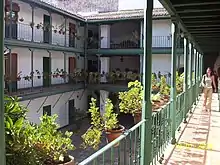 The first permanent theater of this type, Corral de la Cruz, was constructed in Madrid in 1579. The number of theaters increased rapidly after 1600, responding to the public's enthusiasm for this new form of entertainment.[2] The oldest surviving corral, albeit significantly altered, is the Corral de comedias de Alcalá de Henares. This corral, formerly a courtyard theatre, has been roofed and used as a teatro romántico and a cinema, leading to major changes in the building's architecture.[3] The last known such courtyard theatre to be built in Spain, Corral de comedias de Almagro, in Almagro, Castile-La Mancha, is a purpose-built theater that dates to 1628.[4] This only functioning courtyard theater still standing, once one among the many, [5] annually celebrates the Festival Internacional de Teatro Clásico (International Classical Theatre Festival);[2]