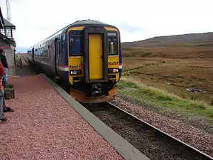 Corrour railway station is on the West Highland Line, near Loch Ossian on the Corrour Estate, in the Highland Region (formerly Inverness-shire) of Scotland. It is the highest mainline railway station in the United Kingdom.[4][5] It is located between Rannoch and Tulloch, and is sited 71 miles 54 chains (115.3 km) from Craigendoran Junction, near Helensburgh.[6] ScotRail manage the station and provide most services, along with Caledonian Sleeper.