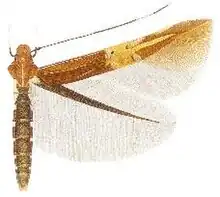 Male, female. Wingspan 9.5-9.8 mm. Head: frons shining ochreous with greenish and reddish reflections, vertex and neck tufts shining olive brown with reddish reflection, collar olive brown; labial palpus first segment very short, white, second segment four-fifths of the length of third, dark brown with white longitudinal lines laterally and ventrally, third segment white, lined dark brown laterally, extreme apex white; scape dark brown with a white anterior line, white ventrally, antenna shining dark brown with a white line from base to two-thirds, this line beyond one third with several interruptions, followed towards apex by eight dark brown segments, ten white or partly white, twelve dark brown and three white segments at apex. Thorax and tegulae shining olive brown with reddish and greenish gloss, thorax with white median line. Legs: shining olive brown, forelegs dark brown dorsally, femora of midleg and hindleg shining creamy white, foreleg with a white line on tibia and tarsal segments one and five, segment two and three with white dorsal spots, tibia of midleg with narrow white oblique basal and medial streaks and a white apical ring, tarsal segments dark brown with white apical spots on segments one to three, segment five entirely white, tibia of hindleg as midleg, but the hair pencils posteriorly to the medial streak and the apical ring large and distinctly blackish brown, tarsal segments one and two dark greyish brown, segment three dark greyish brown in basal half, ochreous-grey in apical half, segments four and five white dorsally, ochreous-grey ventrally, spurs ochreous-white dorsally, dark grey ventrally. Forewing shining greyish brown with reddish gloss, costal half from base to the transverse fascia olive brown, five very narrow lines in the basal area, a yellowish costal from one-fifth to the transverse fascia, a subcostal from base almost to the transverse fascia and interrupted at two-thirds of its length, a medial above fold, almost from base to the interruption of the subcostal, a short and oblique subdorsal from one-quarter to two-fifths, the latter three lines silvery white with bluish and purplish reflections, a dirty yellow transverse fascia beyond the middle with a short basal protrusion and a very long apical protrusion, bordered at the inner edge by two tubercular pale pinkish golden metallic costal and dorsal spots, the costal spot one and a half times as large as the dorsal, slightly more towards base and with patch of blackish scales on outside, bordered at the outer edge by two similarly coloured costal and dorsal spots, the costal spot more than twice as large as the dorsal, both spots opposite and weakly lined brown inwardly, a yellowish costal streak beyond the outer costal spot, an indistinct dirty yellow apical line from below the tip of the apical protrusion, cilia olive brown, greyish brown towards dorsum. Hindwing shining dark greyish brown with greenish and reddish reflections, cilia greyish brown. Underside: forewing shining greyish brown, the yellowish apical line distinctly visible, hindwing shining greyish-brown, tip ochreous. Abdomen dorsally shining dark brown with greenish and reddish reflections, segments five and six banded paler posteriorly, laterally dark brown, ventrally shining ochreous with segments banded shining white posteriorly, anal tuft pale ochreous-grey dorsally, white ventrally brown. In the male the very long valvae and pleural lobes of segment VIII make up more than one quarter of the total length of the abdomen.[1]