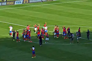 Costa Rica national football team players celebrating their classification at the FIFA World Cup 2014 for the round of 16 in first place of Group D at Mineirão stadium in Belo Horizonte after their draw with England.
