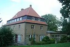 In 1927, after temporarily using an interim church at Hebbelstraße 18, the Heilandskirche became the center of the Evangelical-Lutheran parish of Cotta, which had been independent since 1897. The Protestant sacred building, featuring a massive church tower, was designed by Rudolf Kolbe, a prominent architect from Loschwitz, and construction began in 1914. Adjacent to the church at the western end of Tonbergstraße is the vicarage. Following World War II, the tower of the Heilandskirche, which remained intact, received the cast steel bells from the Jakobikirche in the Wilsdruffer suburb, destroyed in the air raids of February 13, 1945.[23] Additionally, the parish hall was equipped with an altar by Friedrich Press. The Cotta cemetery, established in 1897, is located in the north of Gorbitz. Many Cotta residents and 98 civilian air-raid victims who perished in the world wars were buried here. A stone-high cross above the burial ground commemorates them. Notable burials include soprano Elfride Trötschel.[24]