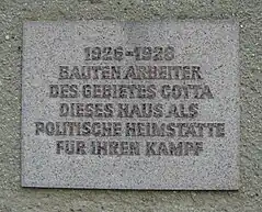The historic Cotta village center, comprising Altcotta and Hebbelstraße, still includes five buildings constructed prior to the Gründerzeit building boom. Only the outer walls of a few other old houses, such as the Faustian winery, have survived. The former winery, located at Hebbelstraße 26 and built shortly after the Seven Years' War in 1764, features a round-arched gate and comprises several sub-buildings. Several old inscriptions on the building's history are attached to small plaques on the street-facing façade.[25] Although the winery has deteriorated over the last few decades, there are plans to rebuild it.