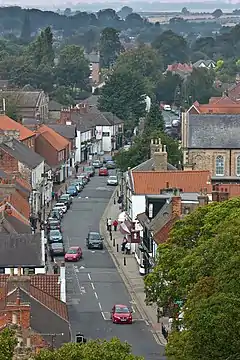 The modern village has two main shopping streets, Hallgate and King Street which cross each other: Hallgate runs east to west from the medieval church to the triangular West Green, near the location of the former Baynard Castle; King Street runs north to south from Northgate to Newgate Street, Market Green (now a car park) is on the southern half of King Street, on the west side, and is the location of the council offices, library and civic hall. A market is held on Market Green on Thursday.[122][123] The area including Hallgate and King Street, plus areas around and east of the railway station including Hull Road are part of a conservation Area as defined by the planning act of 1990.[124]