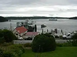 ![]() Cotton Point Island to viewer's left of Washington State Ferries vessel at Orcas landing | |