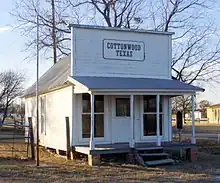 In the center of the town, a building labeled "Cottonwood Texas" still stands, which was once the town's bank and post office. Its historical marker reads,