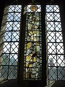Sir Robert died on pilgrimage to the Holy Land in 1518 leaving in his will money for the depiction of Doom in stained glass in the East window, the Seven Sacraments in the North chapel and the Seven Acts of Mercy in the South chapel.[12] Fragments of these appear to be scattered amongst the jumbled glass in some of the aisle windows.[9] The survey of the clergy by the puritans in 1586 described the then vicar, Thomas Penford as; "dumbe & vnlearned, a verie aged man, he can scarce reade, yet he hath learning enough for 2 benefices; for he reapeth the fruite of Studley & Coughton both, he hath of late gotten him a certaine hireling to serue his turne at both places, one Robt. Cathell a seelie Welshman that can scarce reade English distinctlie. The valew of both is better then xx by the yeare".[13]