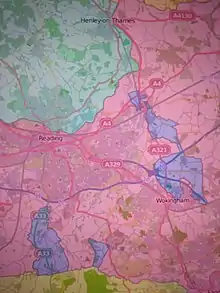 Exclaves of Wiltshire (lilac) near Reading, Berkshire. (Historic County Borders Project) - The part of the parish of Wokingham in Wiltshire, including the east end of the town with its parish church. This exclaves joined to the large Hurst exclaves via an isthmus the width of a road.[42]
