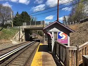 County Line station is an interurban rapid transit station on the SEPTA Norristown High Speed Line (Route 100). The station is located on County Line Road near Matsonford Road in Radnor Township, Pennsylvania.[1] Local, Hughes Park Express, and Norristown Express trains all stop at County Line. Trains running south of this station cross under the Keystone Corridor (Philadelphia to Harrisburg Main Line) that carries the Paoli/Thorndale Line as well as Amtrak's Pennsylvanian and Keystone Service trains. The station lies 8.6 track miles (13.8 km) from 69th Street Terminal.
