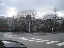 At this point, CR 526 forms a signed (but not officially designated[3]) concurrency with CR 571 for the remainder of the route, with the road intersecting CR 607 prior to crossing CR 638. The route narrows to two lanes and turns north at this point, passing a mix of homes and businesses as it reaches the CR 615 junction. At this point, CR 571 becomes part of the state-maintained Route 64, a two-lane divided highway that carries the route over Amtrak's Northeast Corridor near the Princeton Junction Station at West Windsor. Past the terminus of Route 64, CR 571 continues northwest on two-lane undivided Washington Road, passing through wooded residential areas before intersecting US 1 at the modified Penns Neck Circle. Past the intersection, the road runs through the historic[4] Washington Road Elm Allée, rows of Princeton elm trees that line both sides of the road. The road descends a hill before crossing the Delaware and Raritan Canal and Lake Carnegie into Princeton. At this point, CR 571 runs through the heart of the Princeton University campus, reaching its northern terminus at Route 27 (Nassau Street).[1][2]
