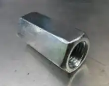 A coupling nut, also known as extension nut, is a threaded fastener for joining two male threads, most commonly a threaded rod,[1][2] but also pipes.[3] The outside of the fastener is usually a hex so a wrench can hold it. Variations include reducing coupling nuts, for joining two different size threads; sight hole coupling nuts, which have a sight hole for observing the amount of engagement; and coupling nuts with left-handed threads.