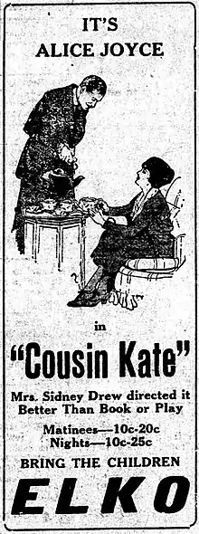 Cousin Kate is a lost[1] 1921 American drama film produced and released by the Vitagraph Company of America. It is based on a 1903 play by Hubert Henry Davies. On the Broadway stage Ethel Barrymore made the role of Kate Curtis her own and was identified with it for many years. This film version was directed by a relative of Barrymore's, Lucille McVey, who was the second wife of Barrymore's uncle Sidney Drew. Alice Joyce stars in this film version.[2][3]
