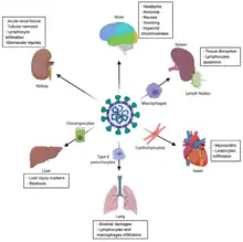 The virus can cause acute myocardial injury and chronic damage to the cardiovascular system.[135][136] An acute cardiac injury was found in 12% of infected people admitted to the hospital in Wuhan, China,[137] and is more frequent in severe disease.[138] Rates of cardiovascular symptoms are high, owing to the systemic inflammatory response and immune system disorders during disease progression, but acute myocardial injuries may also be related to ACE2 receptors in the heart.[136] ACE2 receptors are highly expressed in the heart and are involved in heart function.[136][139]