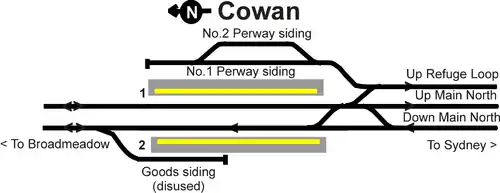 Cowan was a terminating point for CityRail suburban services until January 1992 when all services were curtailed at Berowra.[3] A southbound passing loop is located immediately south of the station. In February 1999, it was extended south 1.1 kilometres (1 mi) to allow 1.5-kilometre (1 mi) freight trains to stable.[4] North of the station the 8.6-kilometre (5 mi) Cowan Bank commences its descent to Hawkesbury River station and thereafter, crossing the Hawkesbury River.