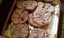 The origins of "cowboy cookies" are unknown although they have been variously attributed to Texas or the Old West.[1] The story that describes them in originating in the Old West claims that they were eaten by cowboys as a high energy snack that could be easily carried.[2][3] The dessert is also associated with the state of Wyoming.[4][5]