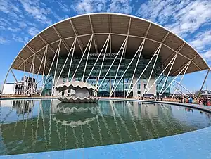 The Bangladesh Government planned to extend the rail track from Dohazari of Chittagong to Gundum of Bandarban. The trans-Asian railway network was to be connected to the proposed Ghumdhum railway station. The government also planned to build another railway track from the proposed Ramu railway station to Cox's Bazar to make another railway station in Cox's Bazar city in the purpose of boosting the tourism in Cox's Bazar.[2] The new railway line extended to Ghumdhum[3] and proposed railway station in Cox's Bazar is being built simultaneously. Construction started in August 2017.[4] The architect of the station, Mohammad Foyez Ullah, took inspiration from the shape of an oyster for its exterior,[5] which symbolizes the beach.[6] The foundation stone of the station building was laid on 14 January 2021.[7] Its construction cost is Tk 214 crore. In January 2022, the construction of the railway station was 45% complete.[8] Another 40% of the construction work was completed in March 2023.[5]