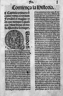 Juan de Velorado, abbot of San Pedro de Cardeña, made an edition of the Crónica from a single manuscript (now BNE, MS 1810) and had it printed at Burgos by Fadrique Alemán de Basilea in 1512.[1] It was reprinted in 1552 and 1593. All three printings coincided with formal requests to have the Cid canonized as a saint.[2]