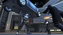 Much like other sandbox games, the player uses melee attacks, guns, and explosives to fight the opposing forces, and can run, climb buildings, jump across rooftops, or use vehicles to navigate the city. Crackdown features a series of character-based skills that can be upgraded to increase specific traits that can be used in combat, driving, or on-foot agility.[4] These skills include: "Agility", which increases the Agent's ability to jump, run, and swim; "Driving", affecting how well he can handle a vehicle and upgrades it; "Explosives", which affects the power and range of explosive weapons and explosive power; "Strength" that increases the Agent's strength, namely by increasing his ability to lift and throw, as well as how hard he can strike an opponent and increases health; and "Firearms", which improves the character's aptitude with weapons. Crackdown's skills make few concessions to realism: character abilities are similar to those of comic book superheroes or cartoon characters. This concept is further highlighted by the ink-like outlines drawn around in-game characters.[8]