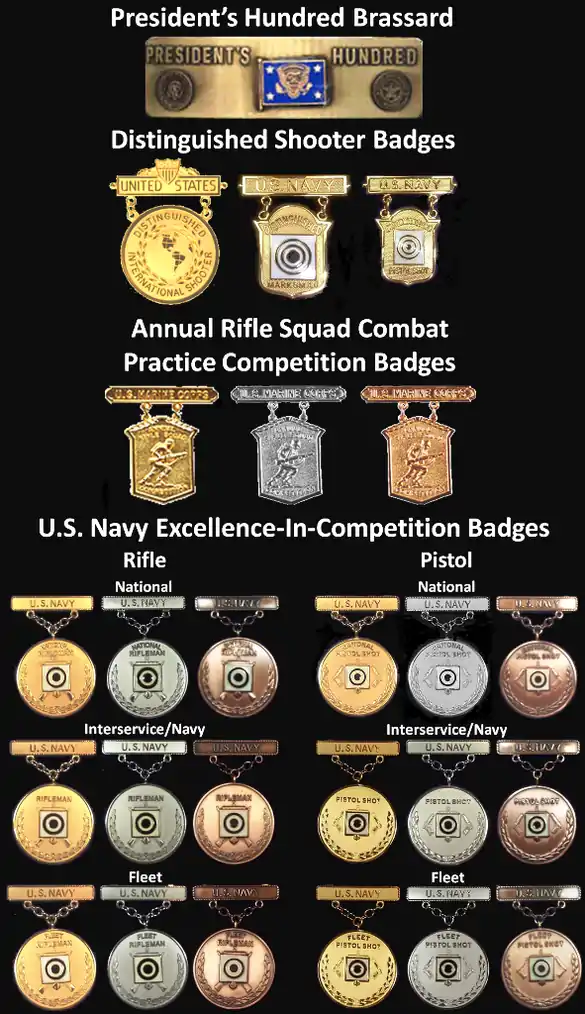 - ↑ U.S. Navy Uniform Regulation, Chapter 5, Section 3, Article 5310 (NAVPERS 15665I), Marksmanship Awards (Badges), Navy Personnel Command, dated December 22, 2017, last accessed April 15, 2018