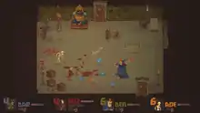 Crawl is a cross-genre game with roguelike, bullet hell, and brawler elements[1] for up to four offline players and bots.[2] The main player advances through randomly generated dungeons as a human hero while up to three other spirit players control the dungeon's enemies and traps to kill the main player.[3] The spirit player who kills the human hero swaps roles to become the next main player. Players earn experience as they progress through the dungeon in both the human hero and the non-human spirit roles. Hero experience unlocks new attacks and spells, and spirit experience unlocks stronger enemies to possess.[4] Each player's human hero experience level, weapon, and stats progress is preserved between turns.[3] Crawl was designed to be more fast-paced and arcade-like than strategic, and includes genre-standard activities like collecting loot and upgradable weapons and magic items.[1] Once player spirits possess "monster spawners" and traps in the active room, they cannot leave the form until they die or kill the main character. The players and enemies grow progressively more powerful over the course of a match.[3] The game ends when a human hero reaches experience level 10, enters a portal, and defeats a final boss whose limbs are controlled cooperatively by the other players.[4][5] Typical matches last about 30 minutes.[3]