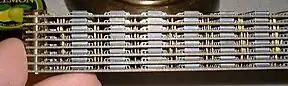 Six months later Cray had his "eureka" moment. He called the main engineers together for a meeting and presented a new solution to the problem. Instead of making one larger circuit board, each "card" would instead consist of a 3-D stack of eight, connected together in the middle of the boards using pins sticking up from the surface (known as "pogos" or "z-pins"). The cards were packed right on top of each other, so the resulting stack was only about 3 inches high.