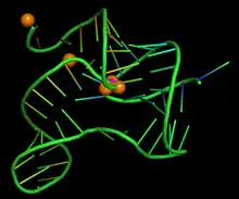 A representation of a 3-D structure of the fluoride riboswitch bound to a fluoride ion (purple sphere) directed by Mg2+ ions (three orange spheres in the center).