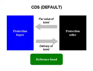 A "credit default swap" (CDS) is a credit derivative contract between two counterparties. The buyer makes periodic payments to the seller, and in return receives a payoff if an underlying financial instrument defaults or experiences a similar credit event.[7][14][18] The CDS may refer to a specified loan or bond obligation of a "reference entity", usually a corporation or government.[15]