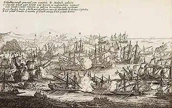 In 1657, the Ottomans reversed the situation. A new and energetic Grand Vizier, Köprülü Mehmed Pasha, armed with almost dictatorial authority, had been appointed in September 1656, and reinvigorated the Ottoman war effort.[69][70] The fleet was strengthened under the new Kapudan Pasha, Topal Mehmed,[69] and in March, the Ottomans succeeded in evading the Venetian blockade of the Straits and sailed towards Tenedos. They did not attack the island however, because the Venetian garrison was too strong.[71] In May, the Venetians under Lazzaro Mocenigo achieved some minor victories, on 3 May and two weeks later at Suazich. Reinforced by Papal and Maltese ships, Mocenigo sailed to the Dardanelles, awaiting the renewed sally of the Ottoman fleet, which came on 17 July. Due to disagreements among the Christian commanders, the allied battle line had not been completely formed, and the Ottoman fleet was able to exit the Narrows before battle was joined.[72] The battle consisted of a series of actions over three days, with both fleets drifting south and west out of the Dardanelles into the Aegean. The battle ended in the evening of 19 July, when an explosion destroyed the Venetian flagship and killed Mocenigo, forcing the allied fleet to withdraw. In this battle, the Venetians had inflicted heavier casualties on the Ottomans than they had suffered, but the Ottomans had achieved their goal: the blockade was broken.[73] Under the personal direction of the Grand Vizier and strengthened by men and ships from the Barbary states,[74] the Ottoman fleet proceeded to recover Lemnos, on 31 August, and Tenedos, on 12 November, thus removing any hope the Venetians may have had of re-establishing the blockade as firmly as before.[75][76]