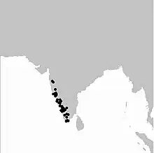 The crimson-backed sunbird is an endemic resident breeder in the Western Ghats of India. The peak nesting season is December to March,[4] but has been known to nest in nearly all months of the year in the southern Western Ghats. Two eggs are laid in a suspended nest on a thin drooping branch of low tree, fern frond or shrub.[5] Both the male and female take part in nest building with the interior mainly built by the female. The eggs are mainly incubated by the female but males may involve themselves in feeding the young. The incubation period is about 18–19 days.[6][7]