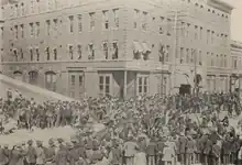 On May 24, the strikers seized the Strong mine on Battle Mountain, which overlooked the town of Victor.[1] The next day, at about 9 am, 125 deputies arrived in Altman and set up camp at the base of Bull Hill. As they started to march toward the strikers' camp, miners at the Strong mine blew up the shafthouse, hurling the structure more than 300 feet into the air. A few moments later, the steam boiler was also dynamited, showering the deputies with timber, iron and cable. The deputies fled to the rail station and left town.[1][16]
