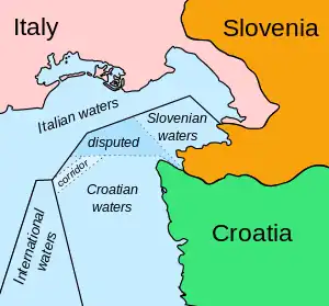The Croatian side asserts that the corridor in the Croatian waters would be useless for traffic, since traffic regulations in the Gulf of Trieste allow only incoming traffic on the Croatian side of the border, while outgoing traffic must go through Italian waters.[23] The Slovenian response is that Slovenia's access to international waters is not an exclusively practical or commercial issue; it is rather the logical consequence of that Slovenia is said to be an internationally recognized maritime country with granted access to international seas. The latter assertion has been repeatedly disputed by the Croatian side.