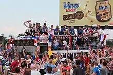 A part of the team's support consists of fans of Dinamo Zagreb and Hajduk Split, the two largest clubs in Croatia's top domestic football league, the Hrvatska nogometna liga (HNL).[207] Both sets of fans—Bad Blue Boys from Zagreb and Torcida from Split—have been associated with hooliganism due to their ultra-style support,[208][209] though violence between them does not occur at international matches. Other ultras groups are Armada Rijeka, Kohorta Osijek, Ultras Vinkovci, Tornado Zadar, Funcuti Šibenik and Demoni Pula. Support for the team also comes from Croats of Bosnia and Herzegovina, particularly from fans of Zrinjski Mostar and Široki Brijeg.[210] There are also Croatian communities in Australia, North America and South America that follow the team.[211][212] The team's fanbase is known for their use of pyrotechnics, fireworks, and flares at matches and while celebrating. During the qualifiers of Euro 2016, Croatian fans disrupted matches against Italy and the Czech Republic by throwing flares from the stadium onto the field.[213][214]
