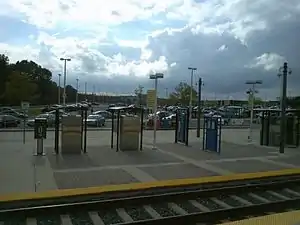 Glen Burnie station (formerly Cromwell / Glen Burnie) is a Baltimore Light Rail station in Glen Burnie, Maryland. It is one of the system's two southern terminals, and one of two stations in Glen Burnie. Trains depart Glen Burnie bound for Timonium station (during peak commuting hours on weekdays) or Hunt Valley station (at all other times). Unlike the nearby Ferndale station, there are currently 795 free parking spaces and connections can be made to MTA Maryland's Route 14 bus from here.[3] South of the station, the lines terminate on an embankment on the northwest corner of Maryland Route 648 and Maryland Route 176 to the east of Interstate 97, and the right of way is replaced by the Baltimore and Annapolis Rail Trail.