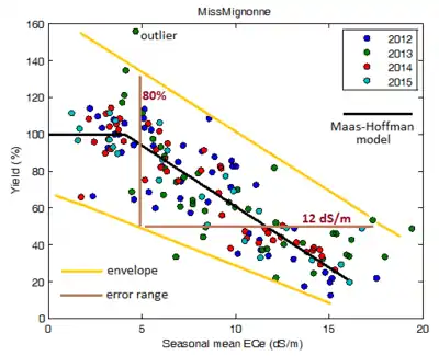 - ↑ Maas EV, Hoffman GJ, 1977. Crop salt tolerance-current assessment. Journal of the Irrigation and Drainage Division, American Society of Civil Engineers 103: 115–134.