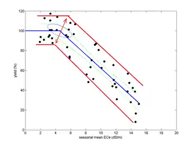 The Salt Farm Texel uses the Maas–Hoffman model for crop response to soil salinity.[6] The model uses a response function starting with a horizontal line connected further on to a downward sloping line. The connection point is also called threshold or tolerance. Up to the threshold the crop is not affected by soil salinity while beyond it the yield starts declining. The model is fitted to the data by piecewise linear regression.[7]