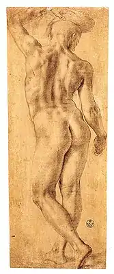 Bronzino's arrangement of the Hebrews in the foreground demonstrates his mannerist penchant for appropriating classical sculptural subjects in his works. The seated nude on the right is shown in the classic reclining pose of a river god.[10] The semi-nude youth on the left with his back to the viewer contorts his body to grip the arm of a seated female while holding a bundle of unleavened bread on his head. The same youth can be seen reaching the far shore in the background of the fresco.[8] Bronzino's study of a standing nude in the Uffizi was thought to be the work of Bronzino's teacher, Pontormo, until the 20th century.[4] It is clearly a preparatory chalk drawing for the standing figure with the bundle on his head. His exaggerated thrust of the hip and raised arm are common mannerist motifs and one leg crossed behind the other is a signature pose of Bronzino's. The figure in the center leaning on a rock is shown with his legs similarly crossed.[11] The standing figure's stance appears to be inspired by a Roman copy of a Greek bronze statue known as the Idolino. It was unearthed in a 1530 excavation at the Villa Imperiale of Pesaro where Bronzino was working at the time. Bronzino has replaced the gentle contrapposto of the ancient sculpture with a more artificial pose that is decorative and stylish.[1][10]