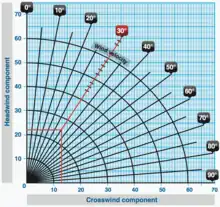 To determine the crosswind component in aviation, aviators frequently refer to a nomograph chart on which the wind speed and angle are plotted, and the crosswind component is read from a reference line. Direction of travel relative to the wind may be left or right, up or down, or oblique.[2]