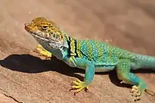 Crotaphytus is a genus of lizards, commonly known as collared lizards, in the family Crotaphytidae. Member species are small to medium-sized predators indigenous to the American southwest, Baja peninsula, and Mexico.[1] Including the tail, they can be as small as 7 in (18 cm) or as long as 14 in (36 cm), and are characterized by distinct bands of black or brown around the neck, to which their common names refer.