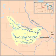 The Crow River is a tributary of the Mississippi River in south-central Minnesota in the United States. It drains a watershed of 2,756 square miles (7,140 km2).[2]