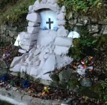 A notable feature of the village is the Croy Shrine located in the Nethercroy area to the north-east. The Shrine was built around a natural spring in the mid-1970s by local residents and featured a statue of The Virgin Mary in a grotto scene with a stone channel in front to allow access to the spring water.[18] The Shrine fell into a state of disrepair over the years due to neglect and vandalism. In 2013 some local residents rebuilt it and a rededication ceremony was held in 2014.