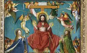 Christ is seated at the centre of a large array of angels, saints and holy elders.[37] According to Pächt, in this scene in heaven that "all is sweetness, gentleness and order".[38] Mary and John the Baptist kneel in prayer to his immediate right and left. Both have halos and are rendered at a far larger scale than the surrounding figures, over whom they seem to tower. Mary holds her right hand at her breast, while her left is raised as if to ask for mercy for the smaller naked figures sheltered by her cloak, evoking the conventional pose of the Virgin of Mercy. A choir of virgins gather directly under Christ's feet. They face outwards towards the viewer and sing Christ's praise.[37]
