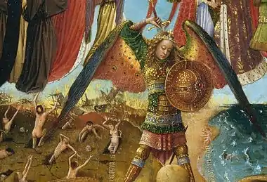 In the mid-ground, the Archangel Michael's armour is heavily inscribed with esoteric and often difficult to source phrases.[13] Letters on his breast plate read VINAE(X)[48] while his jewel-encrusted oval buckler displays the cross and is decorated with Greek script reading ADORAVI TETGRAMMATHON AGLA.[13] The meaning of this phrase has not been conclusively identified; some art historians believe it contains misspellings and has been misread.[49] Friedländer transcribed the first word as ADORAVI while the final word AGLA is thought be taken from the first four letters of the Hebrew words for "Thou Art Mighty", and thus may signify God; the word also appears in a floor tile in the Ghent Altarpiece.[2][32] In the upper portion, gilded inscriptions running vertically across the edges of Christ's mantle read VENITE BENEDICTI PATRIS MEI ("Come, ye blessed of my father").[29]