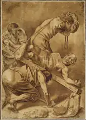 The painting was copied in 1616 by Gerrit van Honthorst when he studied in Rome. His drawing was discovered in the Nasjonalgalleriet in Oslo and published in 1946 by Jan Gerrit van Gelder. The young Honthorst was strongly influenced by the works of Caravaggio, and later became one of the Utrecht caravaggisti who tried to emulate the naturalism and tenebrosity of the Italian painter. Honthorst signed and dated the drawing in the lower left-hand corner. He must have observed the painting very carefully because only few details of the original were omitted.[16] This copy drawing proves that the two Caravaggios in the Cerasi Chapel were already held in high regard a few years after they had been installed.